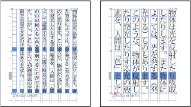 グリッドフォーマットを適用すると、フレームグリッド内のテキストにグリッドフォーマットの属性が設定されますが、文字スタイルや段落スタイルが適用されているテキスト、文字パネルや段落パネルで個々に設定を変更しているテキストには、グリッドフォーマットの属性は適用されません。