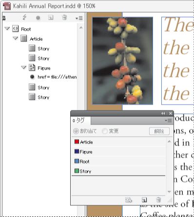Adobe PDF を書き出しダイアログボックスの「一般」セクションにある「タグ付き PDF を作成」オプションを選択して Adobe PDF に書き出す場合、書き出されたページは、ヘッドライン、記事、図などのページアイテムを識別するため、内容を記述する構造タグセットで自動的にタグ付けされます。書き出す前にその他のタグを追加する場合や既存のタグを微調整する場合は、InDesign のタグパネルを使用します。構造ウィンドウ(表示/構造/構造を表示)に変更が反映されます。