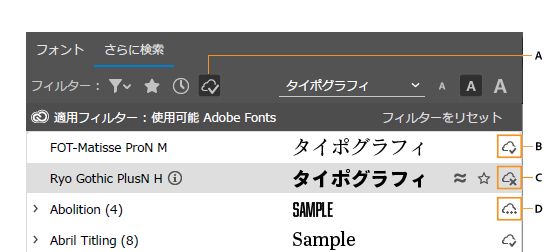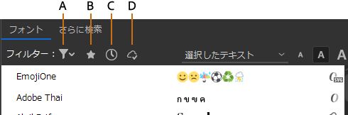 A. 有効化されたフォントフィルター B. 使用可能になったフォントの有効化アイコン C. フォントの有効化を解除アイコン D. フォントの有効化中アイコン