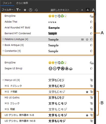 文字パネルまたはアプリケーションのフォントを選択できるその他の領域のフォントファミリーおよびフォントスタイルメニューで、フォントのサンプルを表示できます。また、次のアイコンでフォントの種類が示されます。
