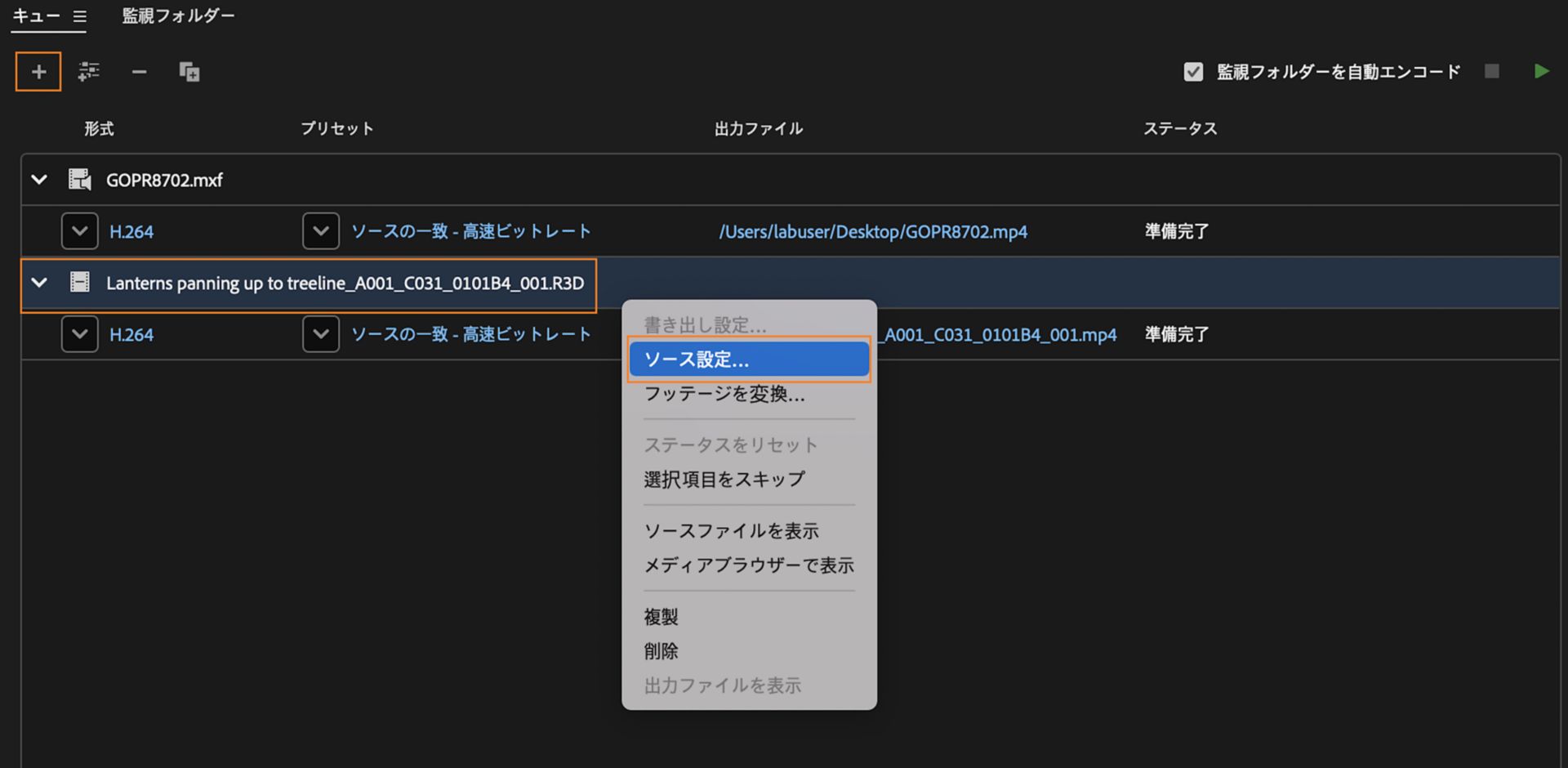 キューパネルで RED(.R3D)ソースファイルを右クリックして、ドロップダウンリストから「ソース設定」を選択します。