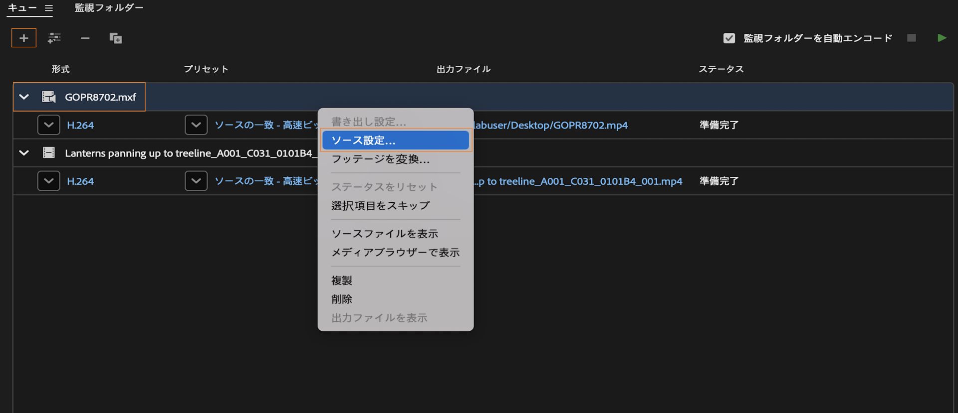 キューパネルの ARRIRAW(.mxf)ソースファイルを右クリックして、ドロップダウンリストから「ソース設定」を選択します。