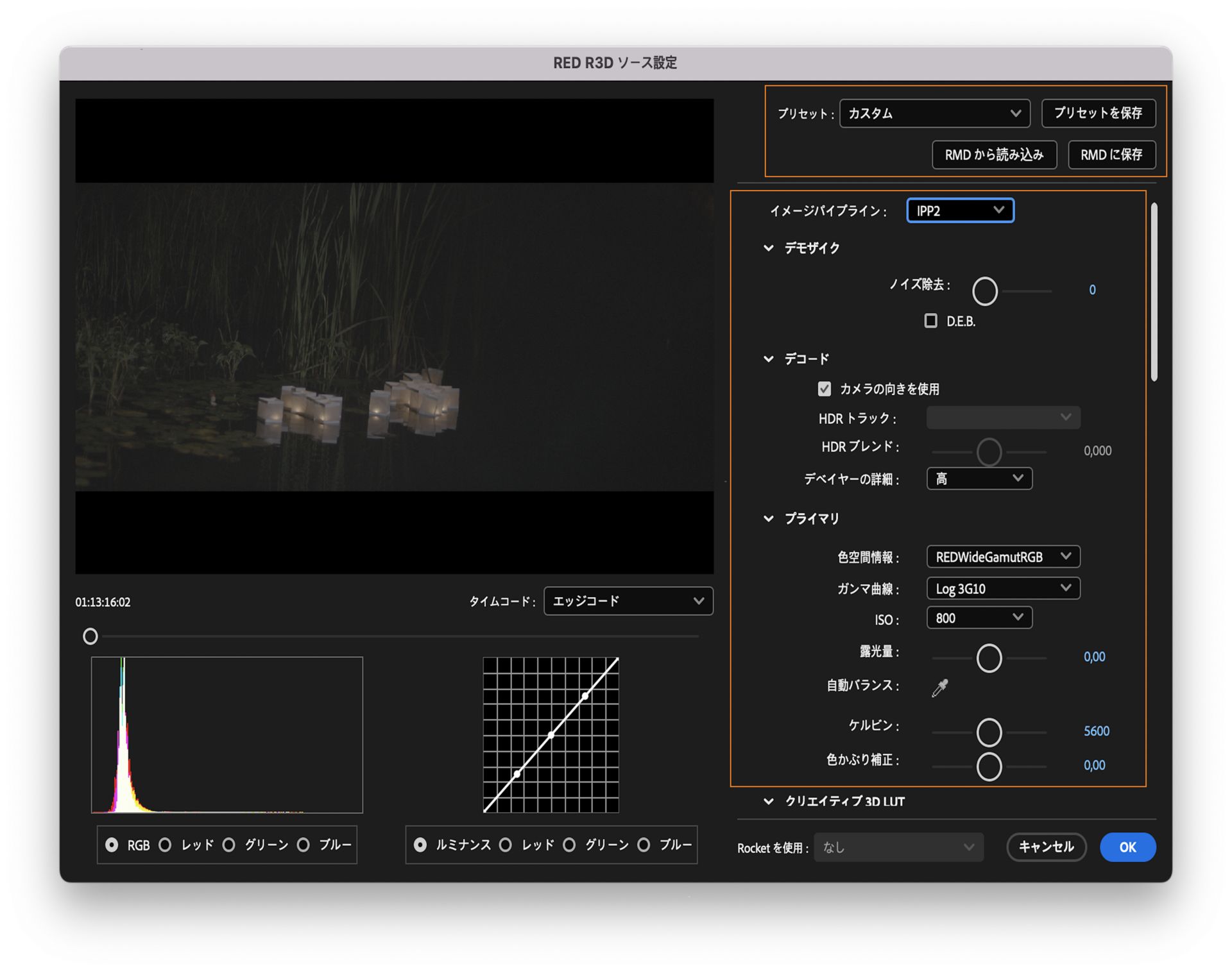 プリセットおよびイメージパイプラインを設定します。 デモザイク、デコード、クリエイティブ 3D LUTおよびその他の様々な設定を RED R3D ソース設定ウィンドウから調整できます。「OK」を選択します。