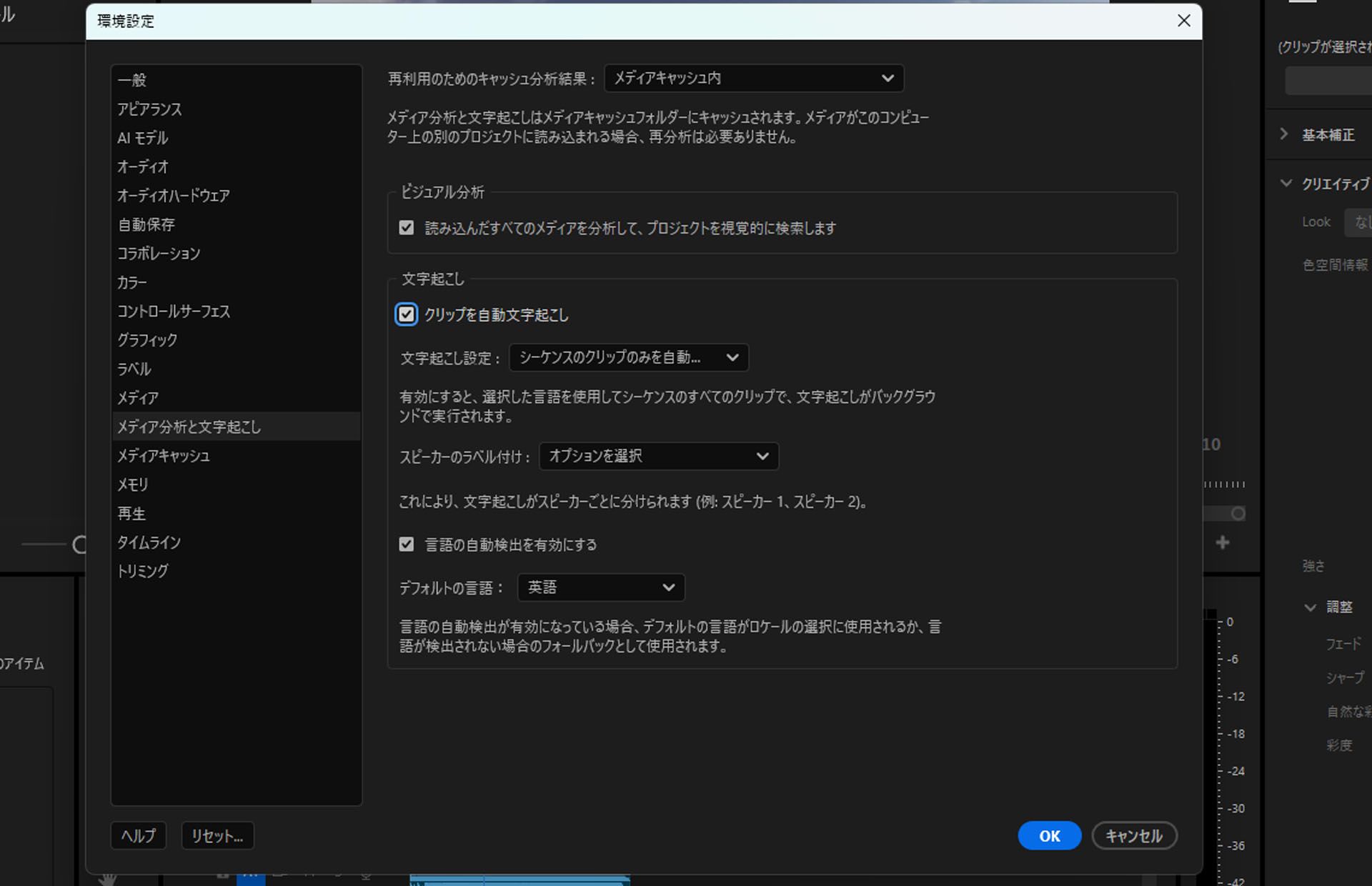 新しい環境設定セクションの「メディア分析と文字起こし」には、既存の「文字起こし」オプションに加えて、分析を管理するためのいくつかの新しい設定があります。