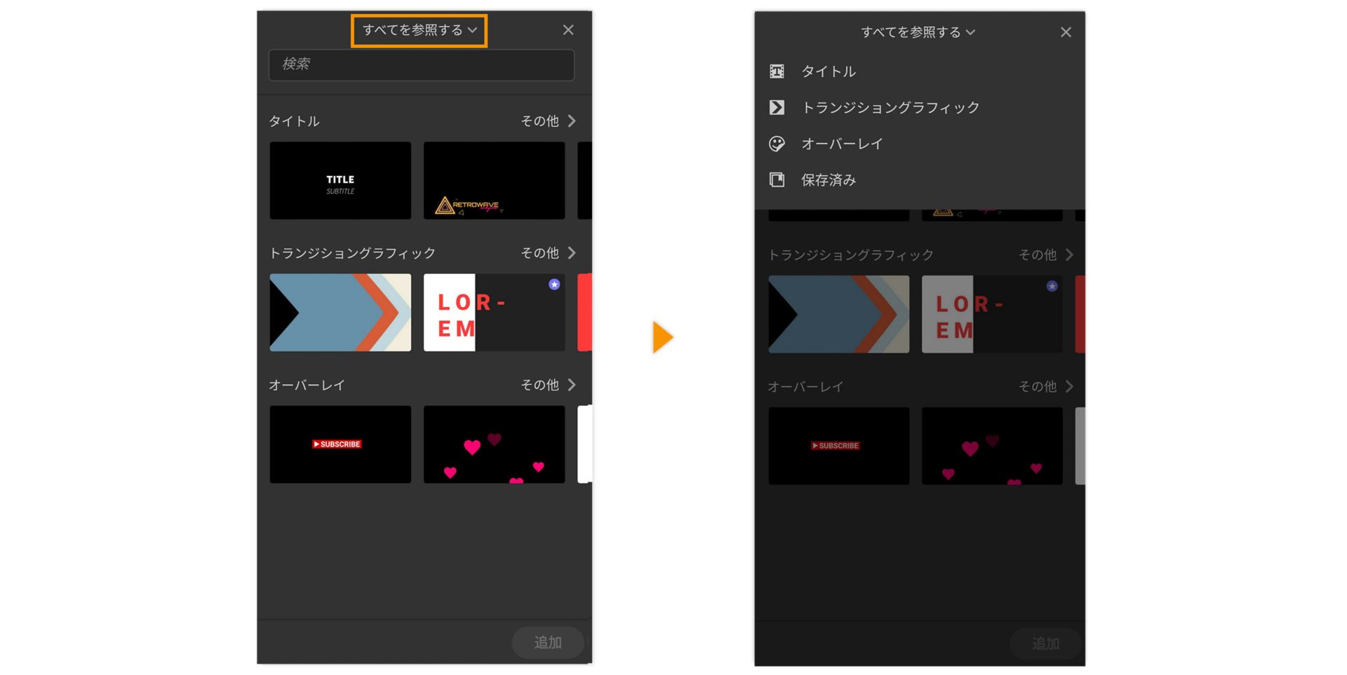 グラフィックの追加 グラフィックの追加 「すべてを参照」ドロップダウンボタンをタップすることによって、タイトル、トランジショングラフィックなど、特定のアセットを検索することもできます。アセットを保存して、「保存済み」から後でアクセスすることができます。