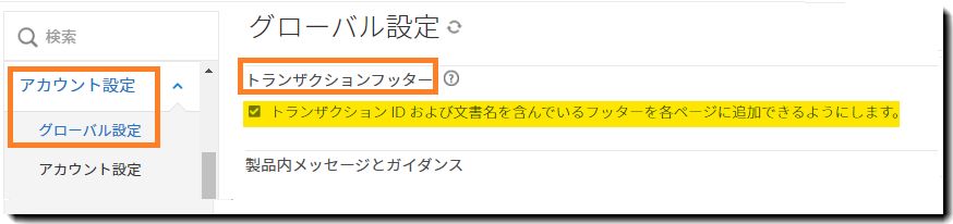 「トランザクションフッター」コントロールがハイライト表示されている「グローバル設定」管理メニュー。