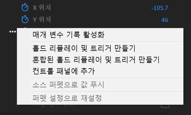 ) 아이콘을 클릭하고 매개 변수 기록 활성화를 선택합니다. 활성화하면 매개 변수 옆에 빨간 점이 표시됩니다. 기록하는 동안 매개 변수 값을 수정하면 모든 변경 내용이 포함된 새로운 테이크가 생성됩니다. 자세한 내용은 테이크 기록을 참조하십시오. 매개 변수에 키프레임과 테이크가 모두 있는 경우 테이크가 우선합니다.