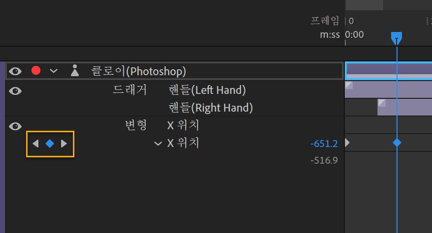 타임라인의 키프레임 탐색기를 사용하여 키프레임 간을 이동하거나 키프레임을 설정 또는 제거할 수 있습니다.