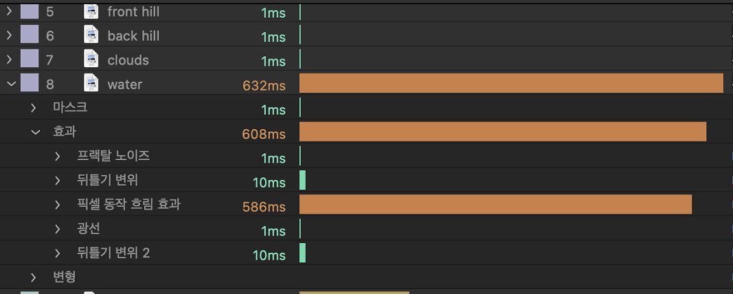각 레이어를 렌더링하는 데 걸리는 시간을 확인하는 것과 더불어, 레이어를 돌리면 마스크, 레이어 스타일, 개별 효과가 총 렌더링 시간에 미친 영향도 분석할 수 있습니다.