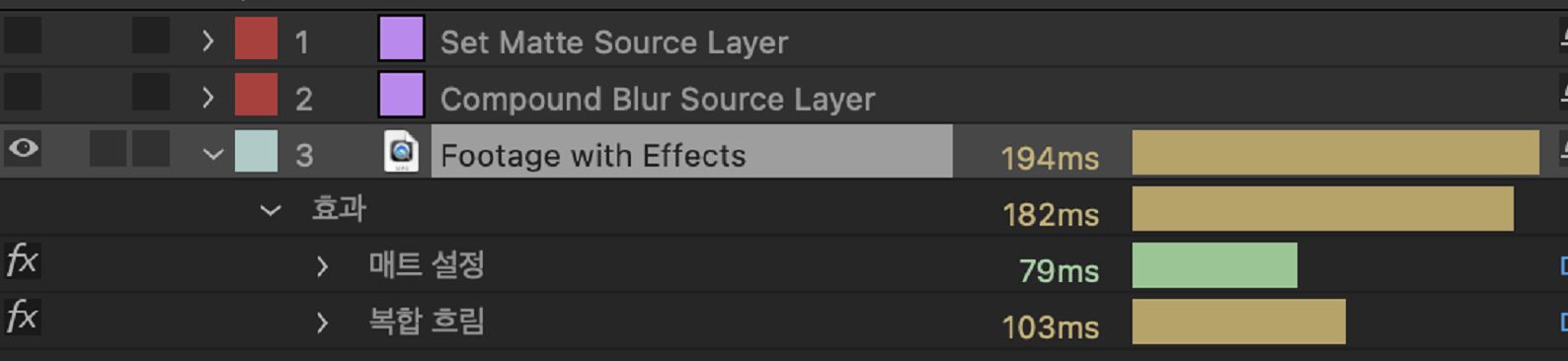 왼쪽 이미지에서는 [매트 설정 소스 레이어]와 [복합 흐림 소스 레이어] 모두 [렌더링 시간 없음]으로 표시됩니다. 하지만 [효과] 레이어가 있는 푸티지의 [매트 설정] 및 [복합 흐림] 효과에 대한 [렌더링 시간]에는 [매트 설정 소스 레이어]와 [복합 흐림 소스 레이어]를 렌더링하는 데 걸리는 시간이 포함됩니다.