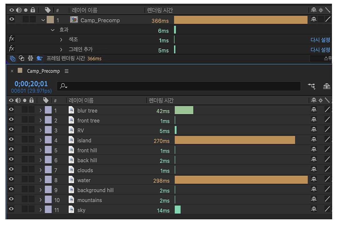 중첩된 컴포지션인 레이어, 즉 사전 컴포지션에는 렌더링 시간이 정확하게 표시됩니다. 사전 컴포지션의 어떤 요소가 레이어 렌더링 시간에 영향을 주는지 더 잘 파악하려면 사전 컴포지션을 열고 [컴포지션 프로파일러]를 사용하여 레이어를 자세히 살펴봐야 합니다.