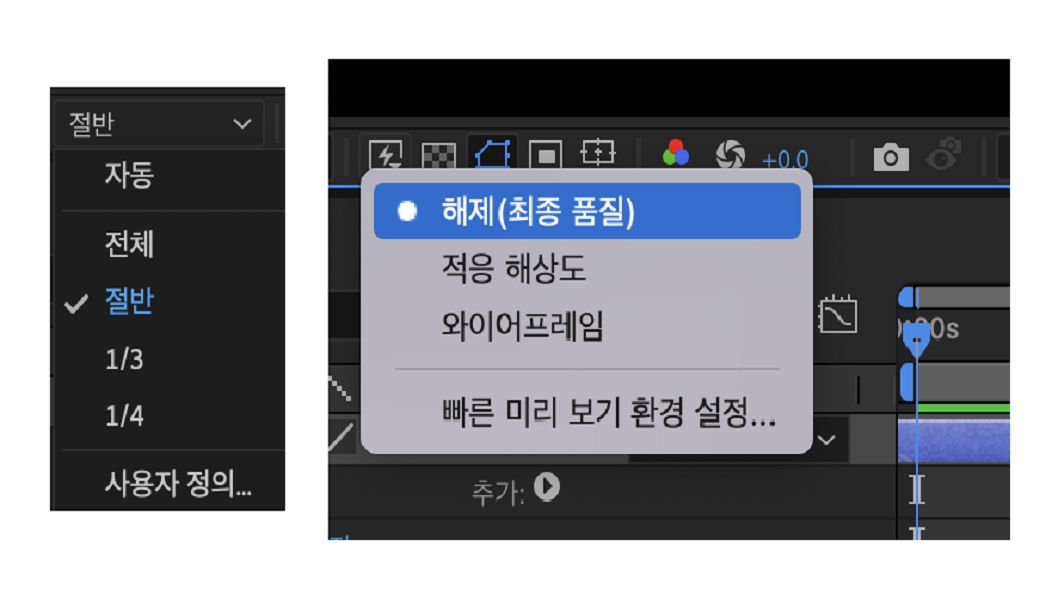 [컴포지션 프로파일러]를 사용할 때는 미리 보기 해상도에서 표시되는 시간이 정확하게 적용되도록 [적응형 해상도]를 해제하세요.