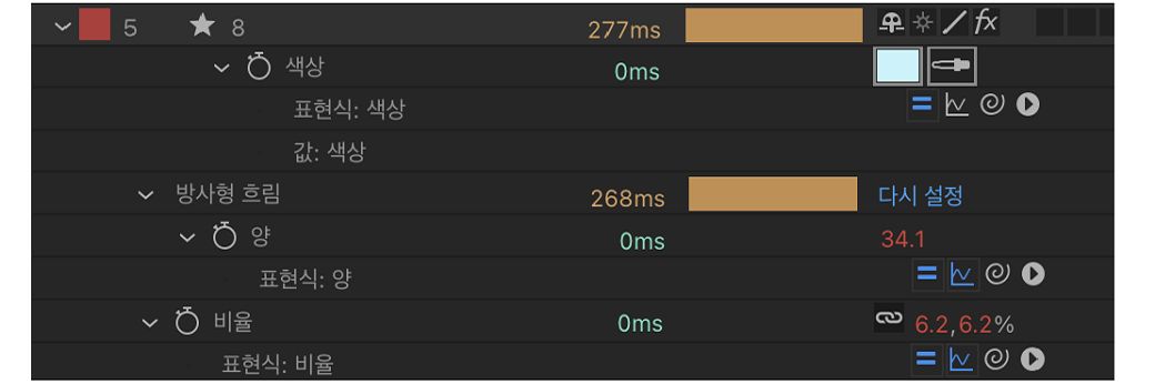 한 레이어에 [비디오 전환]이 꺼져 있지만 다른 레이어의 효과(예: 매트 설정)에서 이 레이어를 참조하는 경우를 가정해 봅니다. 이 경우 해당 효과의 렌더링 시간에는 참조 대상 레이어를 렌더링하는 데 걸리는 시간이 포함되며, 참조 대상 레이어의 렌더링 시간은 비어 있게 됩니다. 이는 After Effects에서 효과의 렌더링 프로세스의 일부로 참조된 레이어만 렌더링하기 때문입니다.