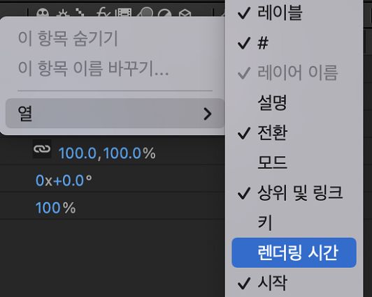 - [타임라인] 창 열 머리글을 마우스 오른쪽 버튼으로 클릭하고 드롭다운에서 열 > 렌더링 시간을 선택합니다.