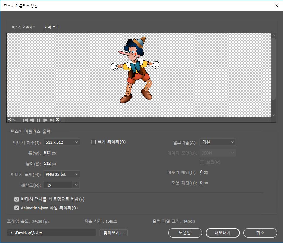 텍스처 아틀라스를 위한 적절한 내보내기 옵션을 선택합니다.