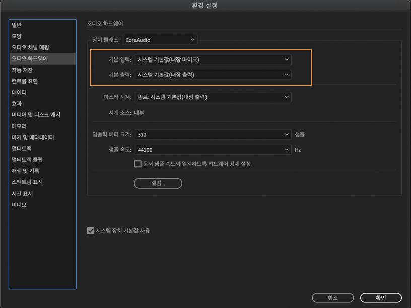 참고:시스템 기본값은 Adobe 응용 프로그램의 새로운 기본 옵션이며 전용 오디오 인터페이스가 없는 사용자에게 예상되는 워크플로를 지원해야 합니다.