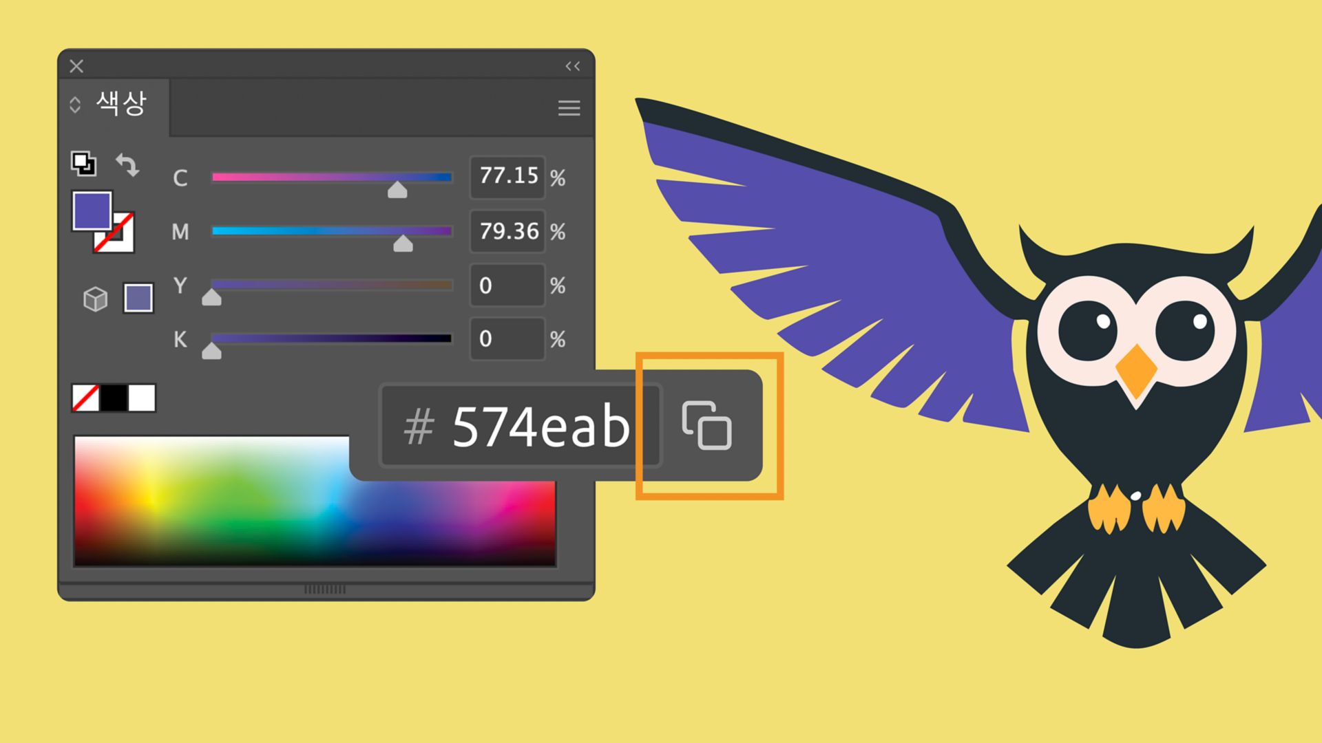 이제 Illustrator에서 색상 패널, 색상 피커, 새 색상 견본 또는 색상 견본 옵션 대화 상자에서 바로 색상 값을 복사할 수 있습니다. 원하는 색상을 선택하고 을 선택하여 16진수 값을 복사한 후 문서나 브랜드 자산 전체에서 즉시 공유할 수 있습니다.