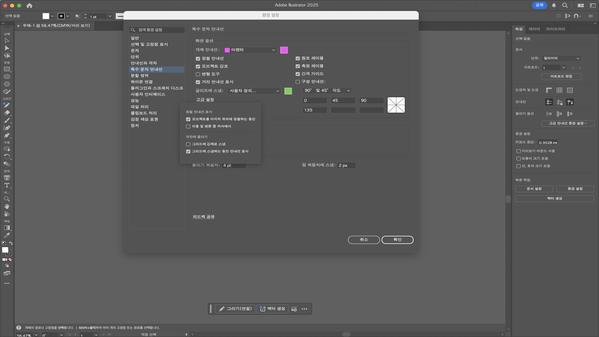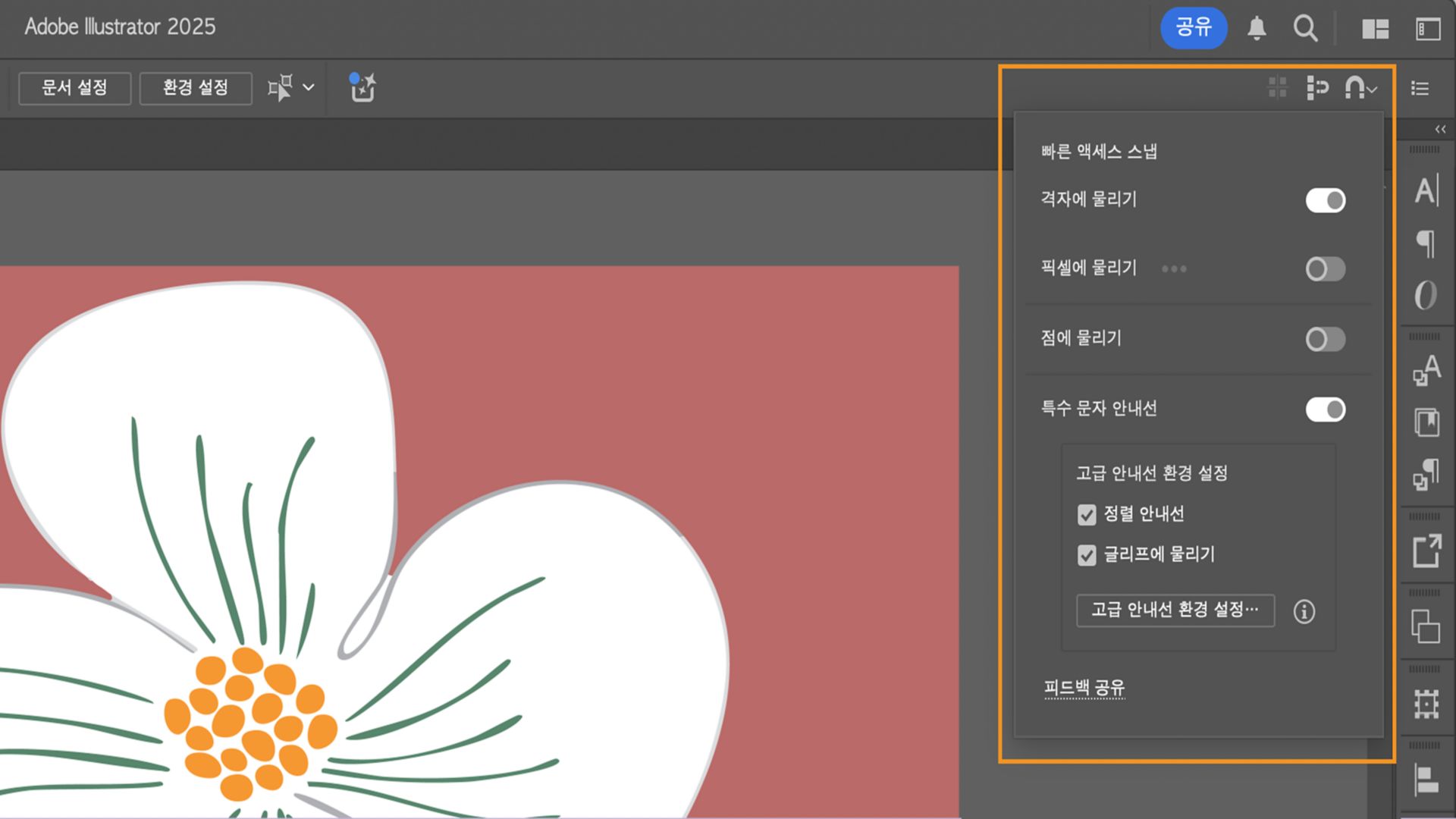 캔버스에서 오브젝트를 정렬하고 스냅하는 방식을 사용자 지정하려면 고급 안내선의 새로운 고급 설정을 사용하세요. 그리드에 강제로 스냅할지 선택하고, 스냅 허용치를 조정하거나, 스냅 중 안내선을 표시하여 스냅이 작업에 원활하게 조정되도록 할 수 있습니다.