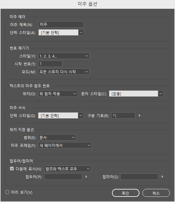 이 있는 새 프레임에 만들어집니다. 장식을 클릭하면 [미주 옵션] 대화 상자가 열립니다. - 미주 프레임은 다른 스토리에 스레드할 수 없습니다.