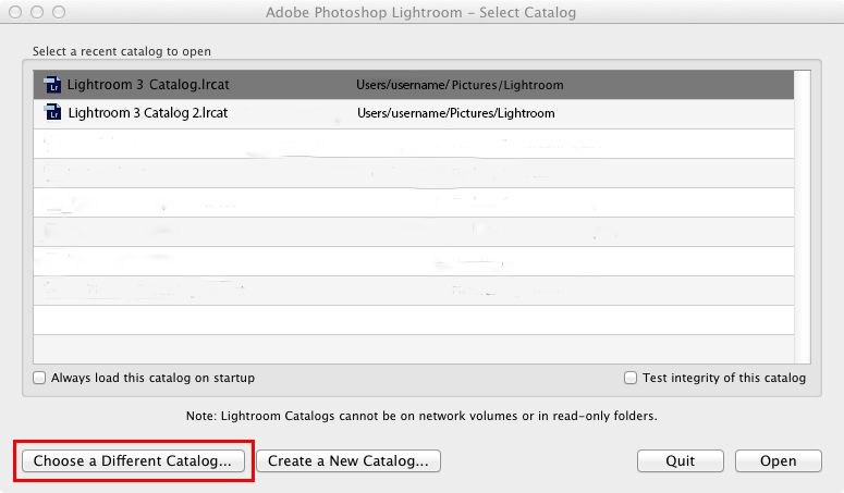- 컴퓨터에 카탈로그를 백업할 때 생성된 카탈로그가 여러 개 있을 수 있습니다. 실제 가장 최신 카탈로그 대신 이러한 카탈로그를 열어서 사용하지 않도록 주의하십시오. 기본적으로 백업한 카탈로그는 C:\사용자\[사용자 이름]\Pictures\Lightroom\Lightroom <버전> Catalog\Backups\(Windows) 또는 /사용자/[사용자 이름]/Pictures/Lightroom/Lightroom <버전> Catalog/Backups/(Mac OS)에 있습니다. 하지만 백업을 실행할 때 이 위치를 변경한 경우 다른 위치에 있을 수 있습니다.