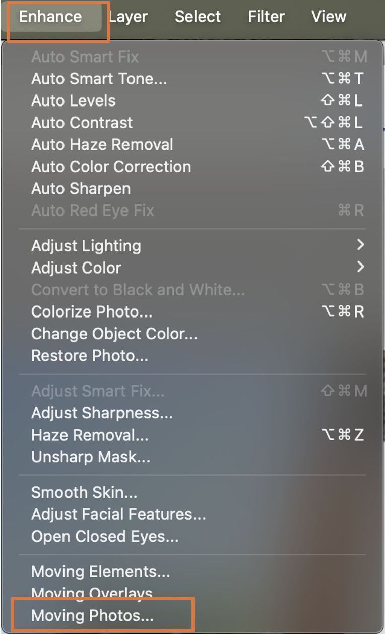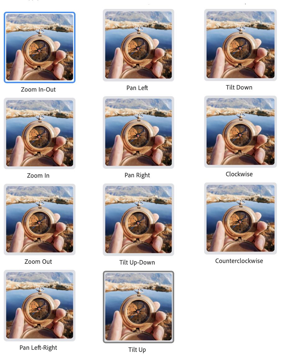 In the Moving Photos workspace, choose from the 11 available motion presets: