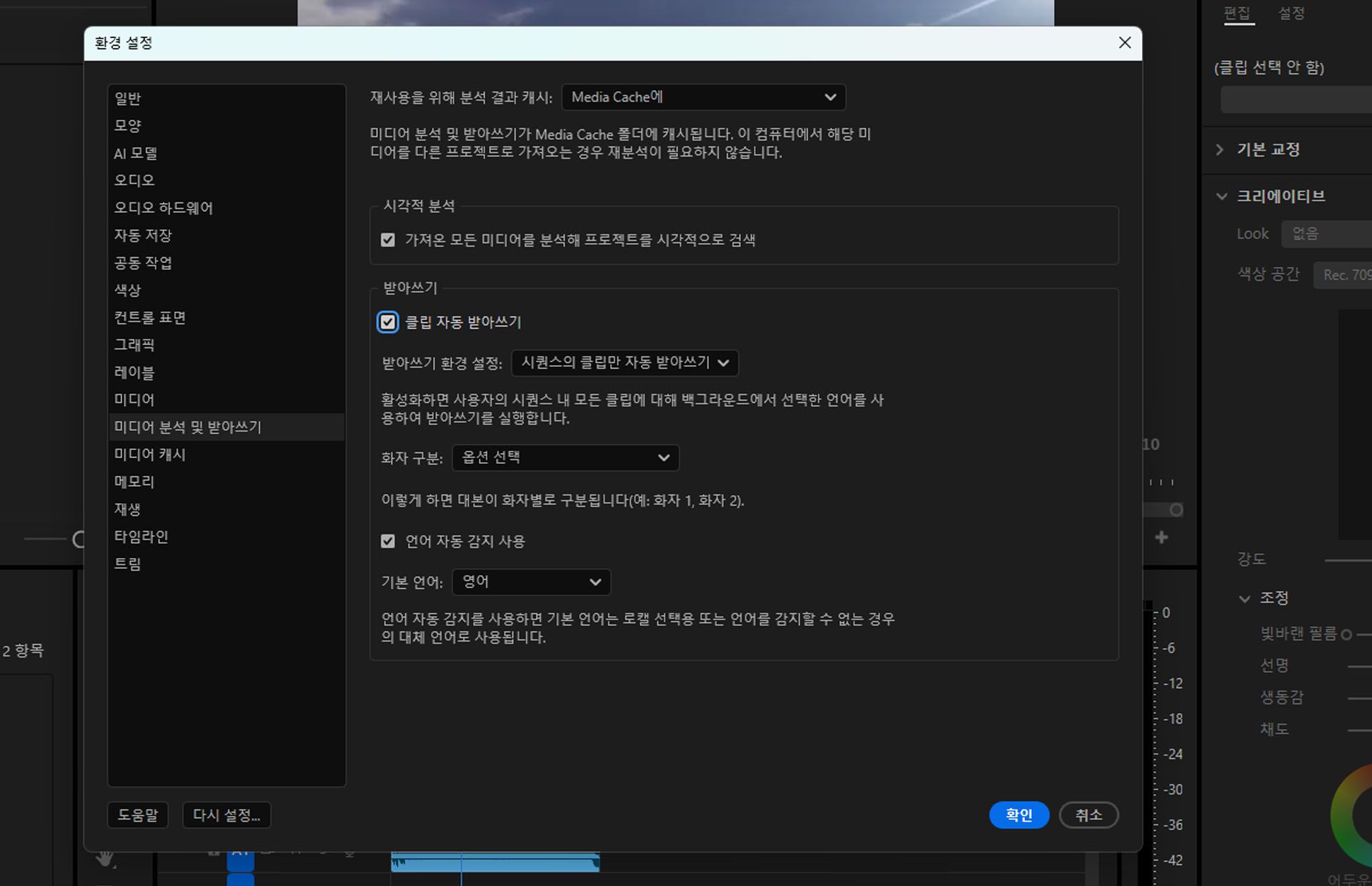 Premiere Pro는.prmi 확장자가 있는 파일을 사용하여 분석된 또는 받아쓴 각 클립 옆에 있는 사이드카 파일로 분석 결과를 캐시합니다. 미디어와 사이드카 파일을 다른 컴퓨터에 공유할 수 있으며 Premiere Pro는 사이드카 파일을 사용하여 푸티지를 다시 분석할 필요가 없습니다. 프로덕션에서 작업할 때 권장되는 환경 설정입니다.