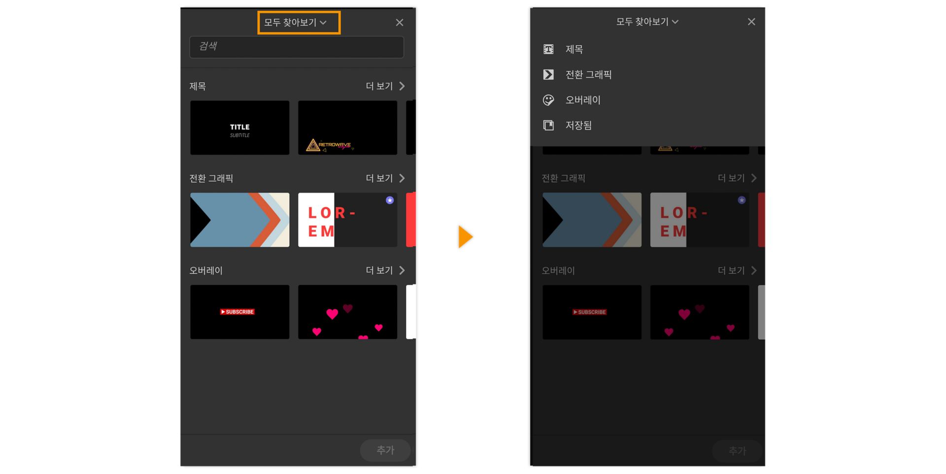 클립의 한쪽에만 전환을 추가하려면 전환 스타일을 드래그하여 클립 가장자리에 배치합니다.