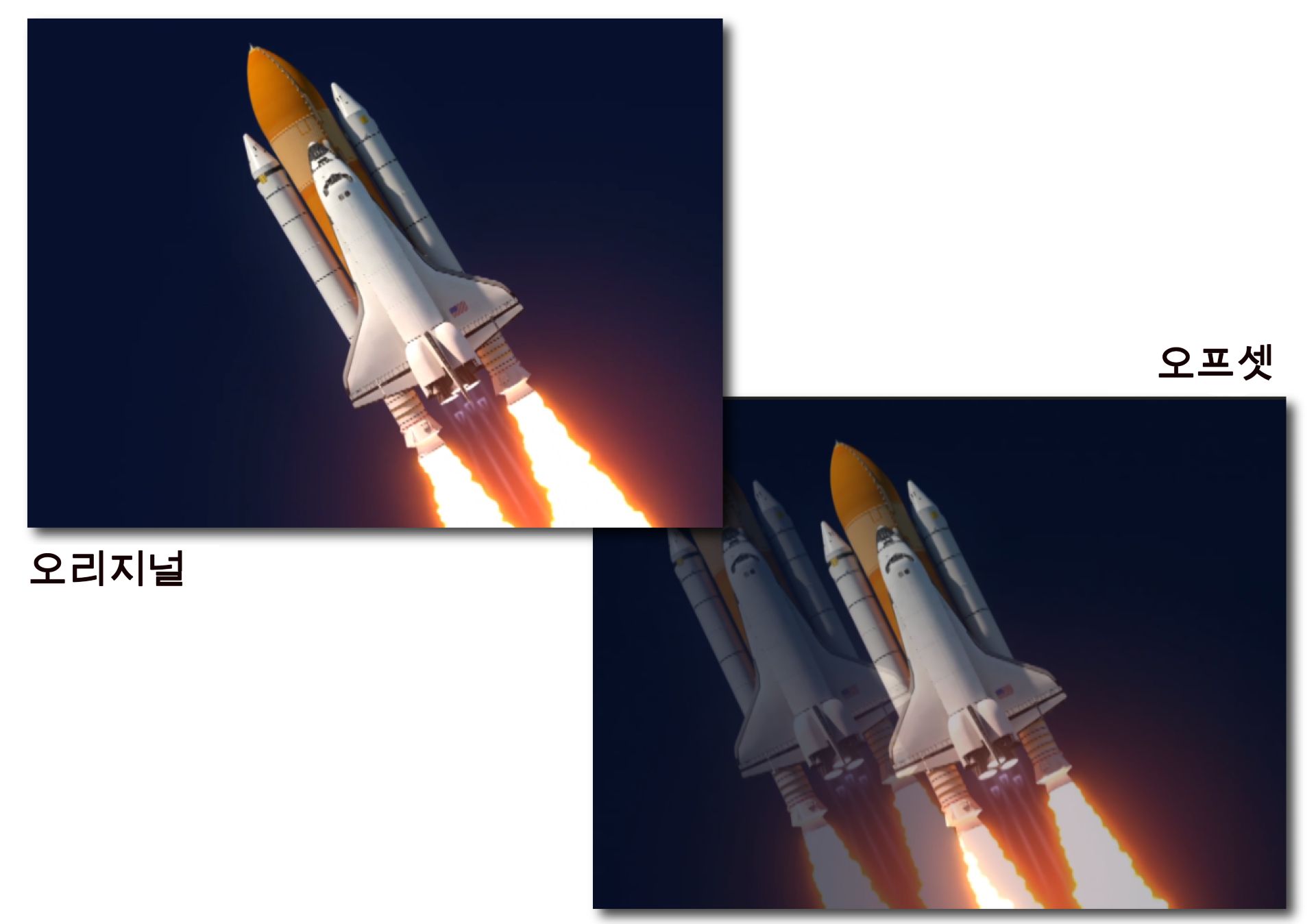 [오프셋] 효과는 클립 내에서 이미지를 팬합니다. 이미지의 한쪽에서 밀어낸 시각 정보가 반대쪽에 표시됩니다.