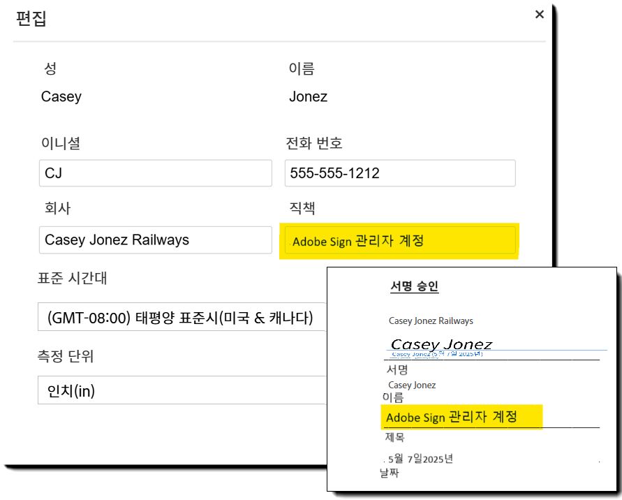 Acrobat Sign 내에서 사용자 세부 정보를 업데이트할 수 있지만 이러한 변경 사항은 Acrobat Sign 서비스에만 적용됩니다. 여기에서 이루어진 업데이트는 다른 Adobe 제품 또는 서비스에 대한 사용자의 액세스에 영향을 미치지 않습니다.