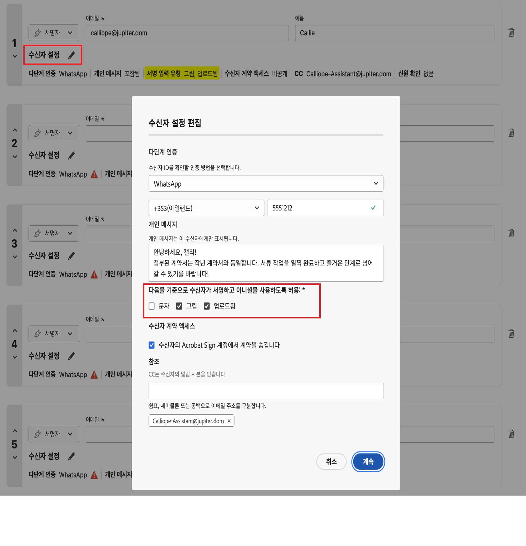 서명 흐름은 수신자 필수 서명 순서 확인란에 의해 결정됩니다.