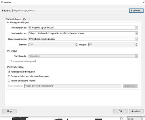 Als u de standaardweergave van het 3D-model wilt wijzigen wanneer het niet is geactiveerd, selecteert u een optie voor de posterafbeelding. Selecteer Bladeren om de gewenste afbeelding te vinden.
