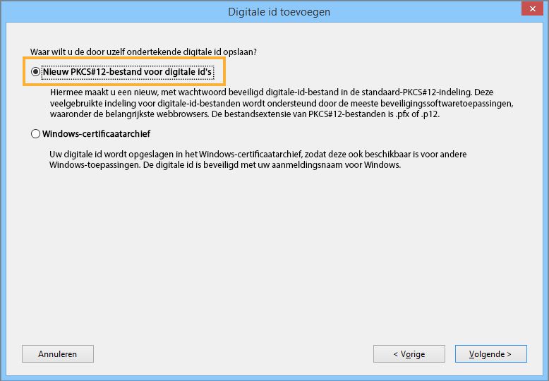 Selecteer de optie Een nieuwe digitale id die ik nu wil maken. Klik dan op Volgende.