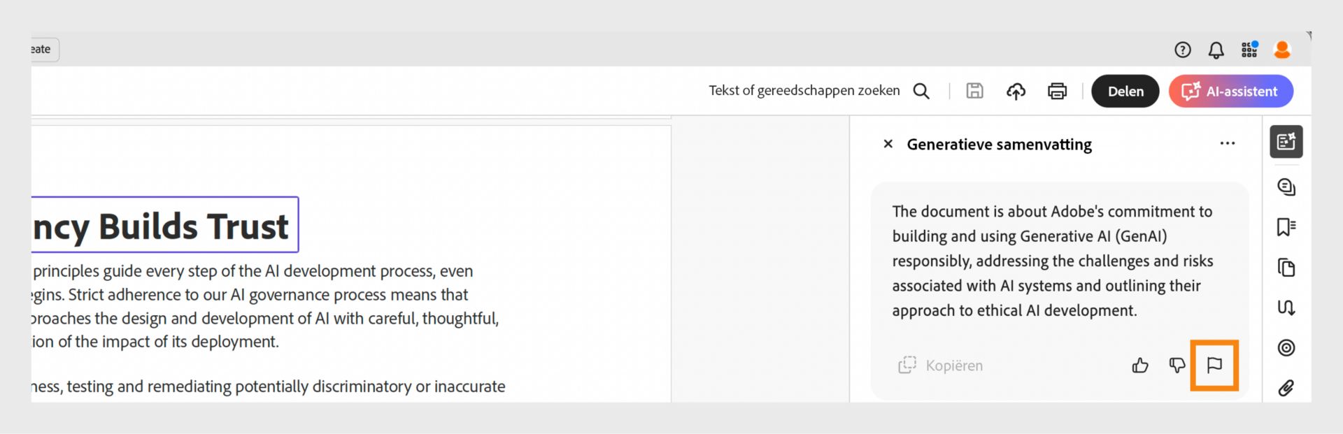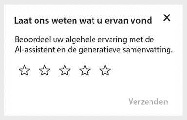 Nadat u de AI-functies vier of meer keer hebt gebruikt, wordt u in Acrobat of Acrobat Reader gevraagd uw algemene ervaring met de functies AI-assistent en Generatieve samenvatting te beoordelen. Selecteer een beoordeling en verzend deze. Als de beoordeling 2 of minder is, toont de widget een tekstveld om feedback in te voeren.