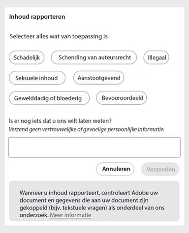 U kunt zelfs inhoud rapporteren die volgens u ongepast is. Adobe zal deze zorg onderzoeken en zo nodig passende maatregelen nemen.