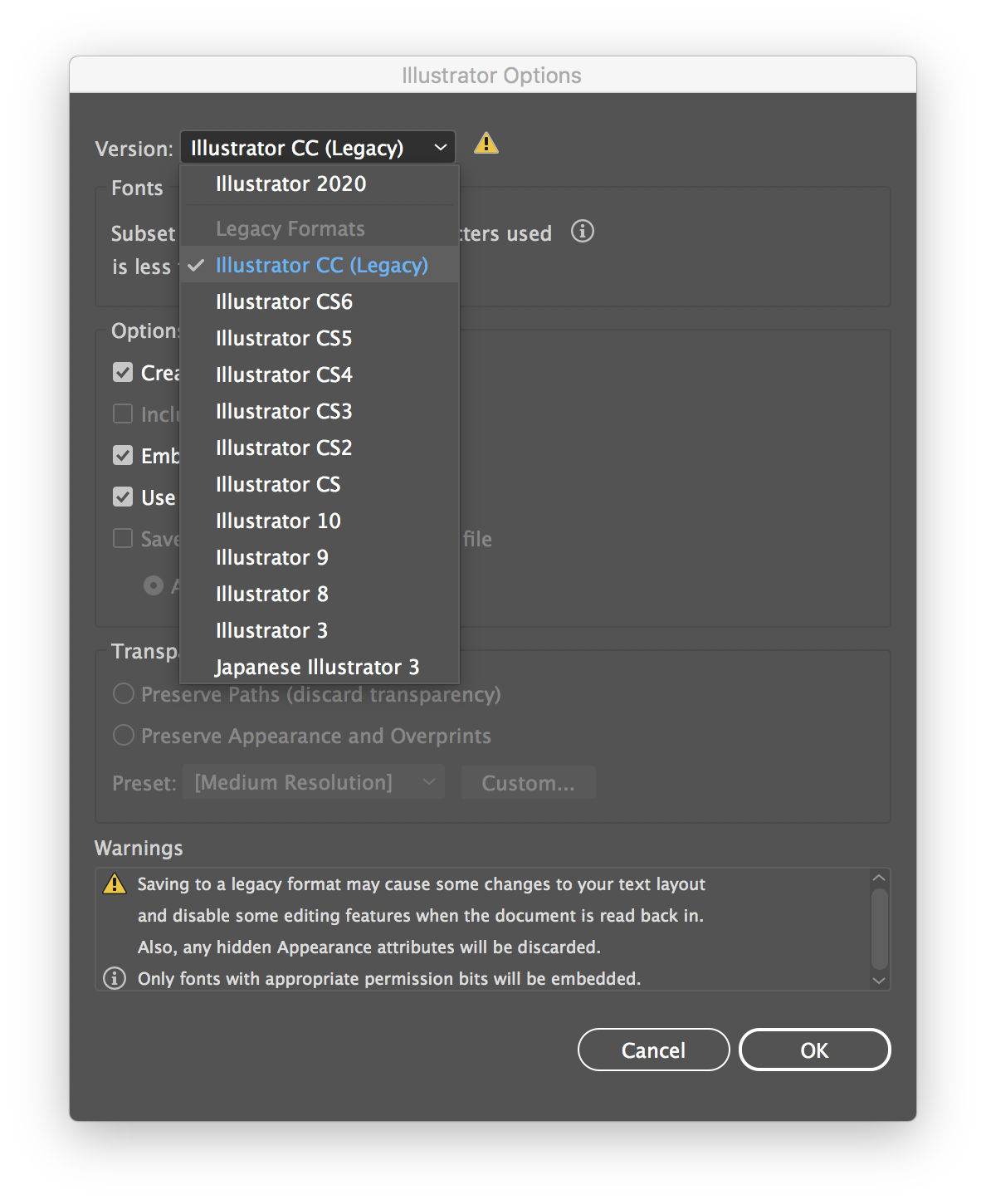 Workaround: In Illustrator, choose File > Save As, specify the file name, and click Save. Set Version to Illustrator CC (Legacy) in the Illustrator Options dialog box. Alternatively, upgrade to Character Animator version 3.1.