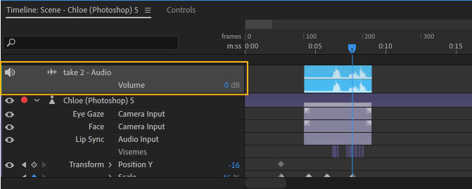The audio track shows the waveform of the audio file helping you adjust the timing of puppets, takes, and visemes to the audio. Audio tracks appear twice as tall as other tracks by default, and can be resized as needed by dragging the bottom edge of the track header vertically.