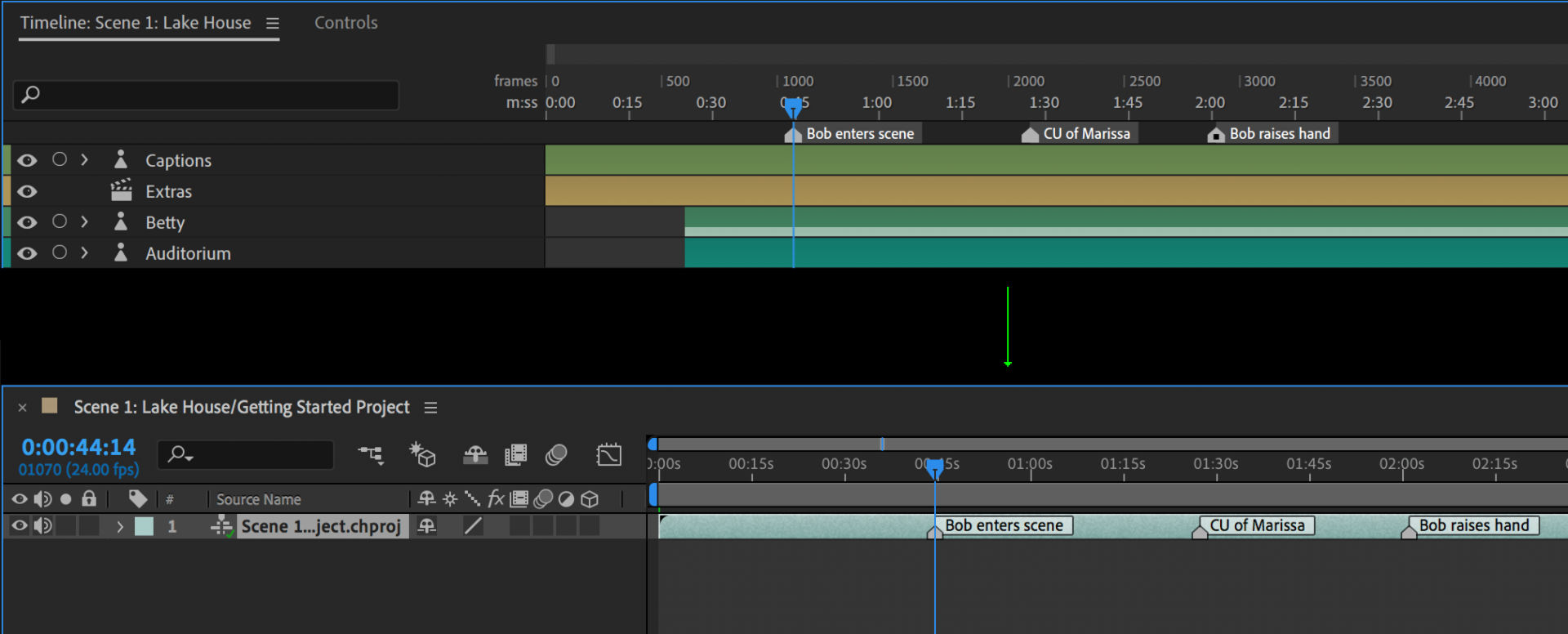Markers in a Character Animator scene appear in other applications using Dynamic Link. For example, when you drag a scene from Character Animator’s Project panel into After Effects’s Project panel, those scene’s markers appear as composition markers in After Effects.