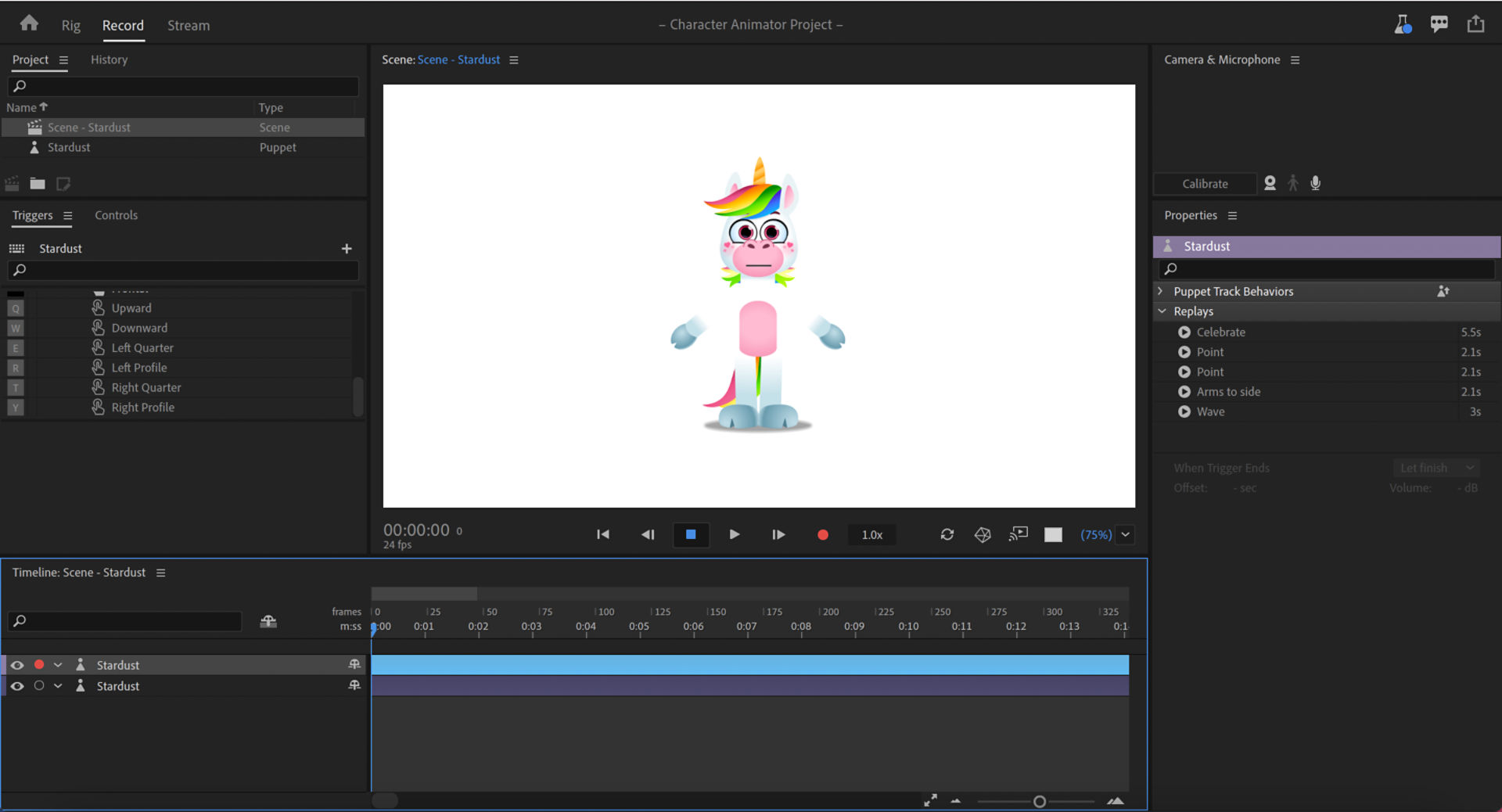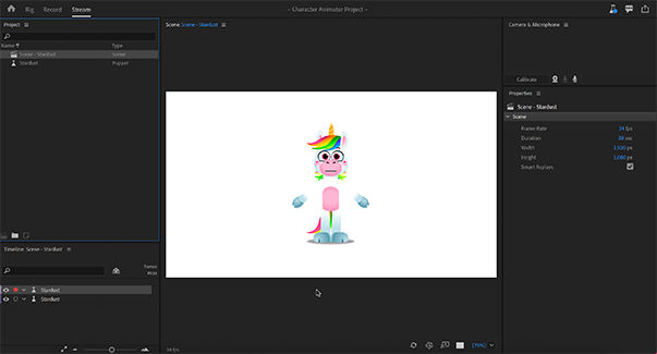 Record, playback, and fine-tune the performance of your puppet in the workspace. You can adjust the timings of the recorded takes, and modify the behavior properties. You can add multiple puppets to the timeline from the Projects panel.