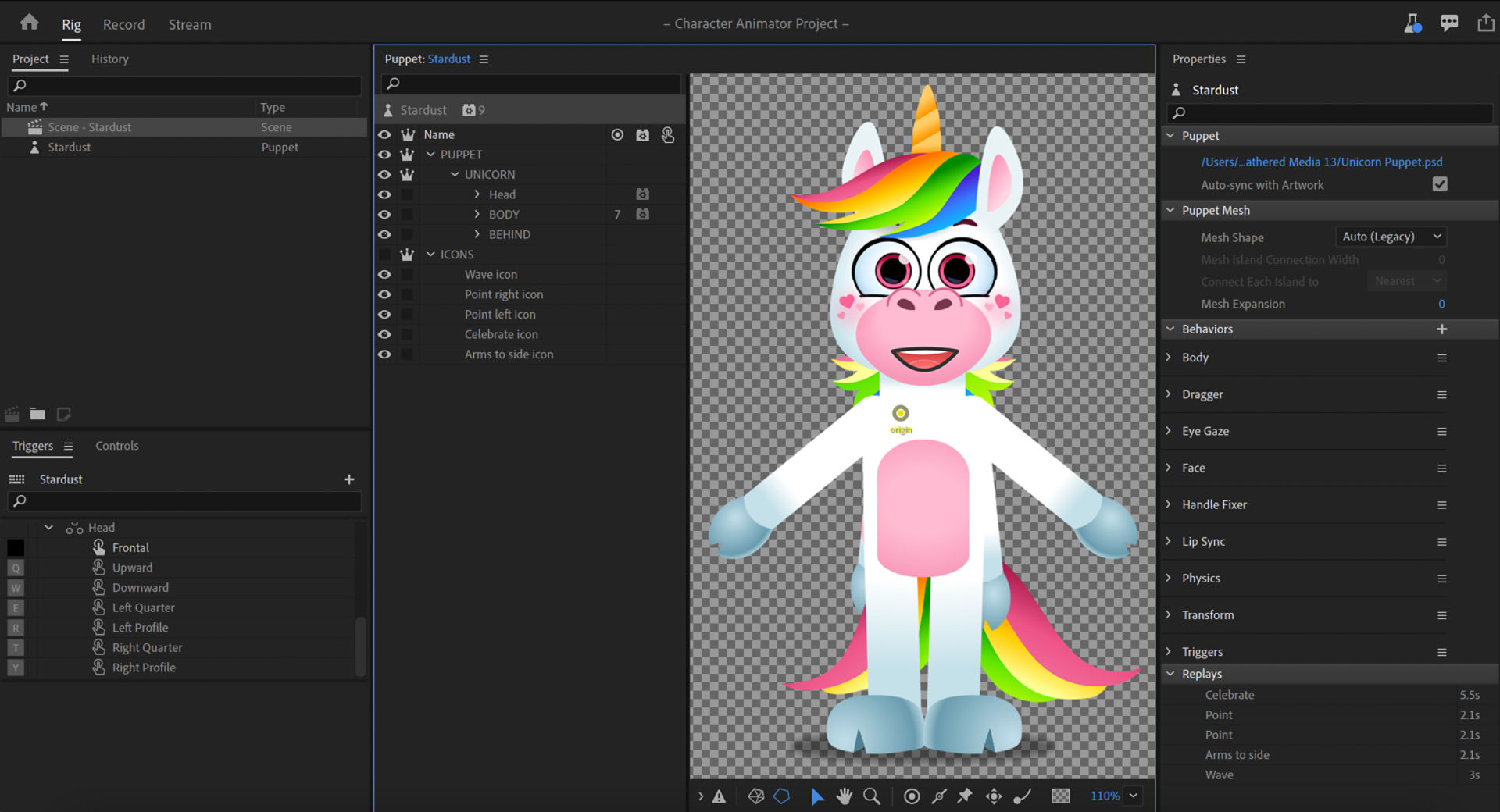 Rig workspace allows you to edit the puppet structure. You can add or modify behaviors, rearrange puppet layers, add handles to puppet , and modify keyboard triggers. To access the workspace, do any of the following: