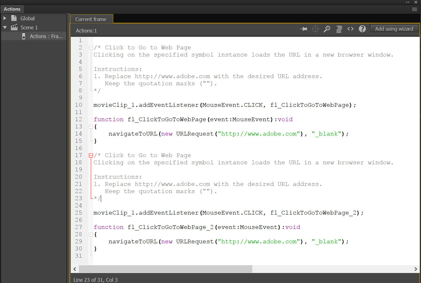 Als u een object selecteert dat niet al een instantienaam heeft, wordt er door Animate een instantienaam toegevoegd als u het fragment toepast.