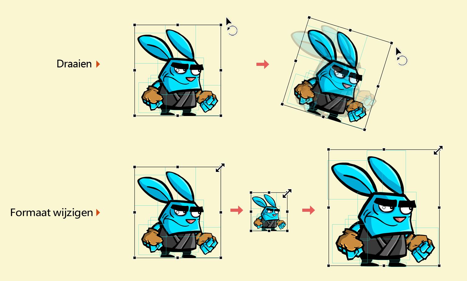 Lees het artikel Grafische objecten transformeren en combineren om meer informatie over het gebruik van het gereedschap Transformatie te krijgen.