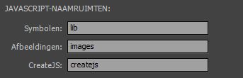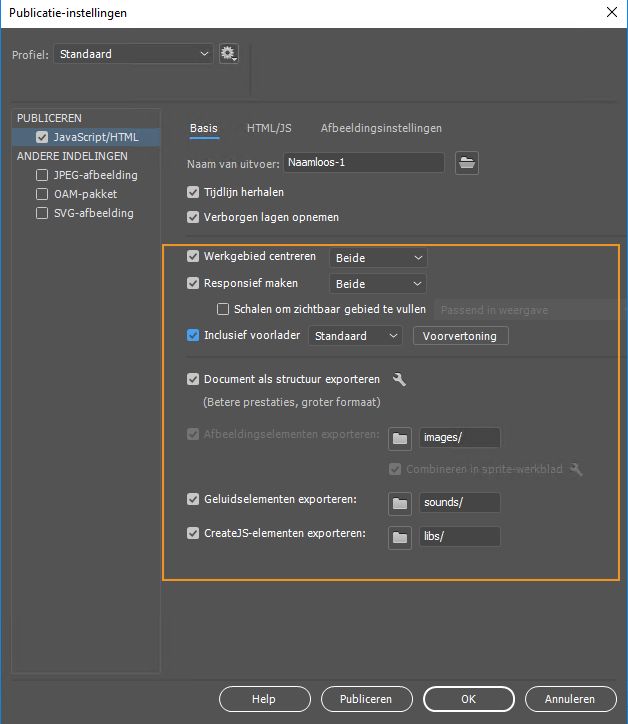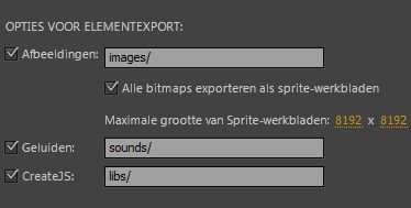 - FLA-elementen niet automatisch worden geëxporteerd, aangezien de exportopties voor afbeeldingen, geluid en ondersteunende CreateJS JavaScript-bibliotheken standaard zijn uitgeschakeld en omdat de relatieve URL's worden toegepast bij het exporteren.