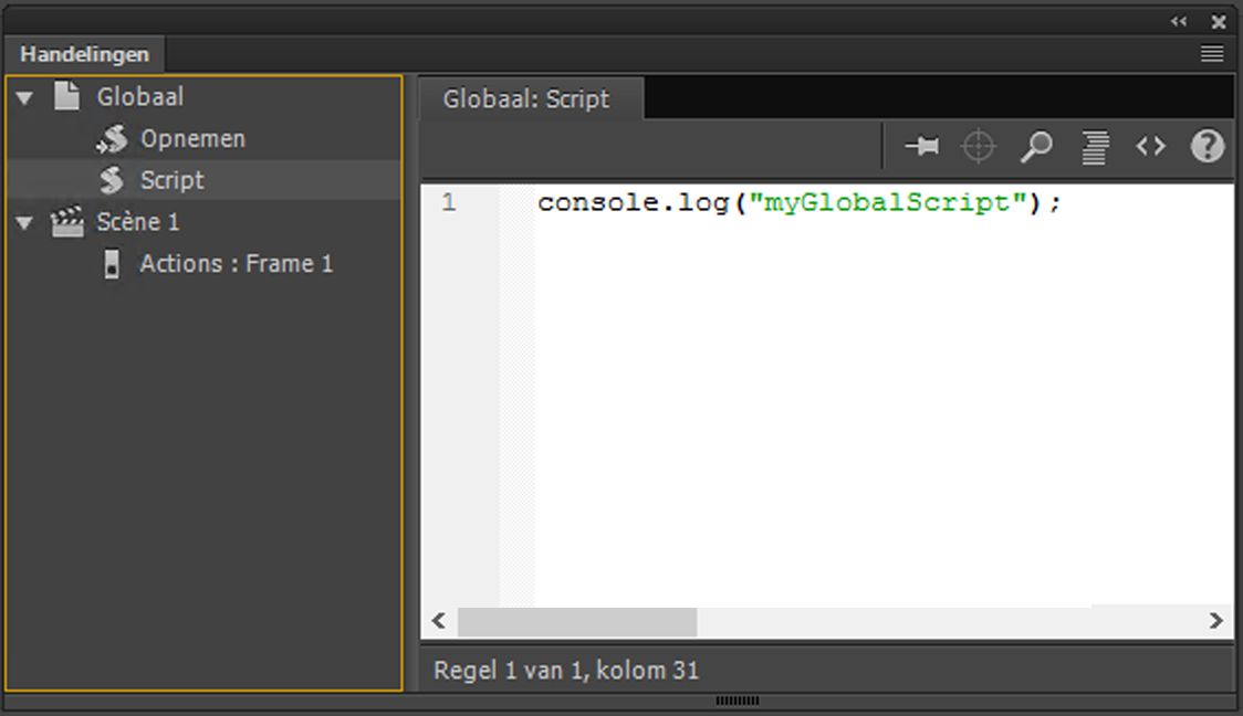 In het gedeelte Globaal script kunt u scripts schrijven die van toepassing zijn op meerdere documenten, ofwel binnen Animate of als een extern script.
