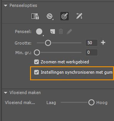 - Schakel het selectievakje Instellingen synchroniseren met gum in voor het penseel (B).
