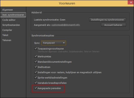Aangepaste penselen die door u zijn gemaakt, kunnen met de cloud worden gesynchroniseerd via de Animate-voorkeuren. Om dit te doen gaat u naar Bewerken > Voorkeuren op Windows of Animate > Voorkeuren op een Mac. De optie om aangepaste penselen in de sectie "Instellingen synchroniseren" te synchroniseren wordt hieronder getoond: