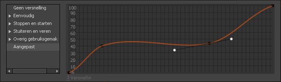 Kies Aangepaste versnelling om uw eigen versnelling in te stellen met de curve Aangepaste versnelling in de Bewegingseditor. U kunt deze aangepaste versnelling dan toepassen op elke eigenschap van een geselecteerde tween.