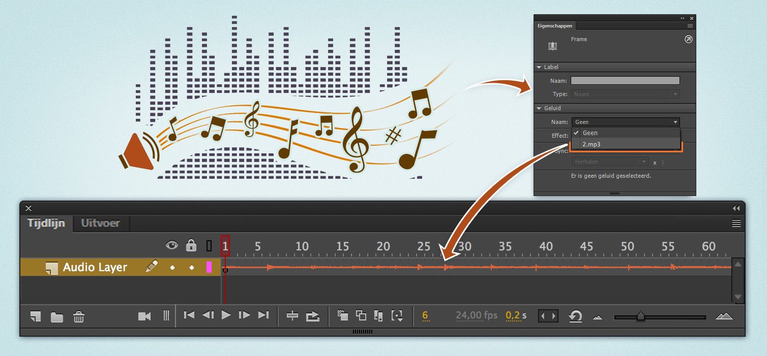 Animate werkt met twee soorten geluid: gebeurtenisgeluiden en streaminggeluiden:
