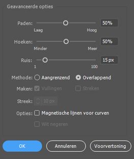 Legt de nadruk op hoeken en de kans dat een scherpe bocht verandert in een hoekpunt. Een hogere waarde resulteert in meer hoeken.