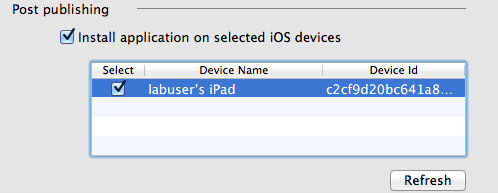 naast de vervolgkeuzelijst Doel om het dialoogvenster AIR for iOS-instellingen te openen. - Op het tabblad Implementatie wordt een lijst met alle aangesloten apparaten weergegeven. Selecteer de apparaten waarop u de toepassing wilt publiceren.