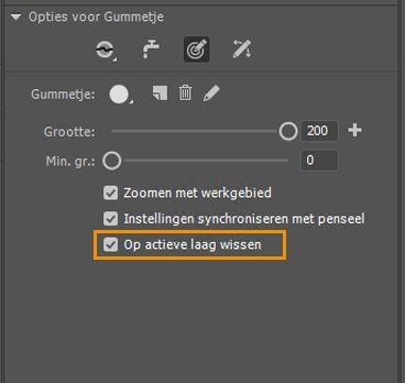 Schakel het selectievakje Op actieve laag wissen in voor het gummetje (E).